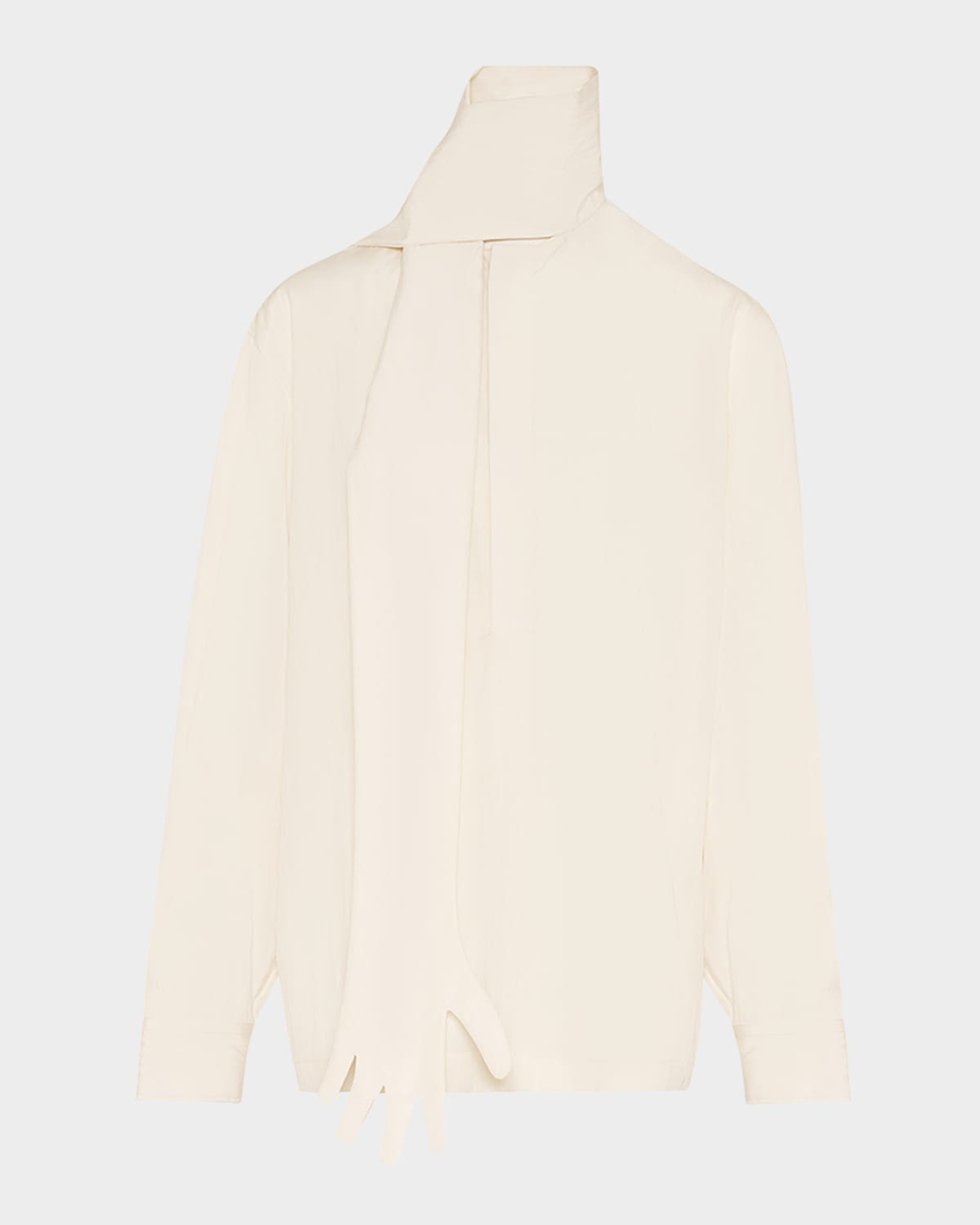 Jean Paul Gaultier shirt featuring a glove neck scarf High neckline Long sleeves; barrel cuffs Loose fit Pullover style Lyocell/nylon/polyamide Made in Italy