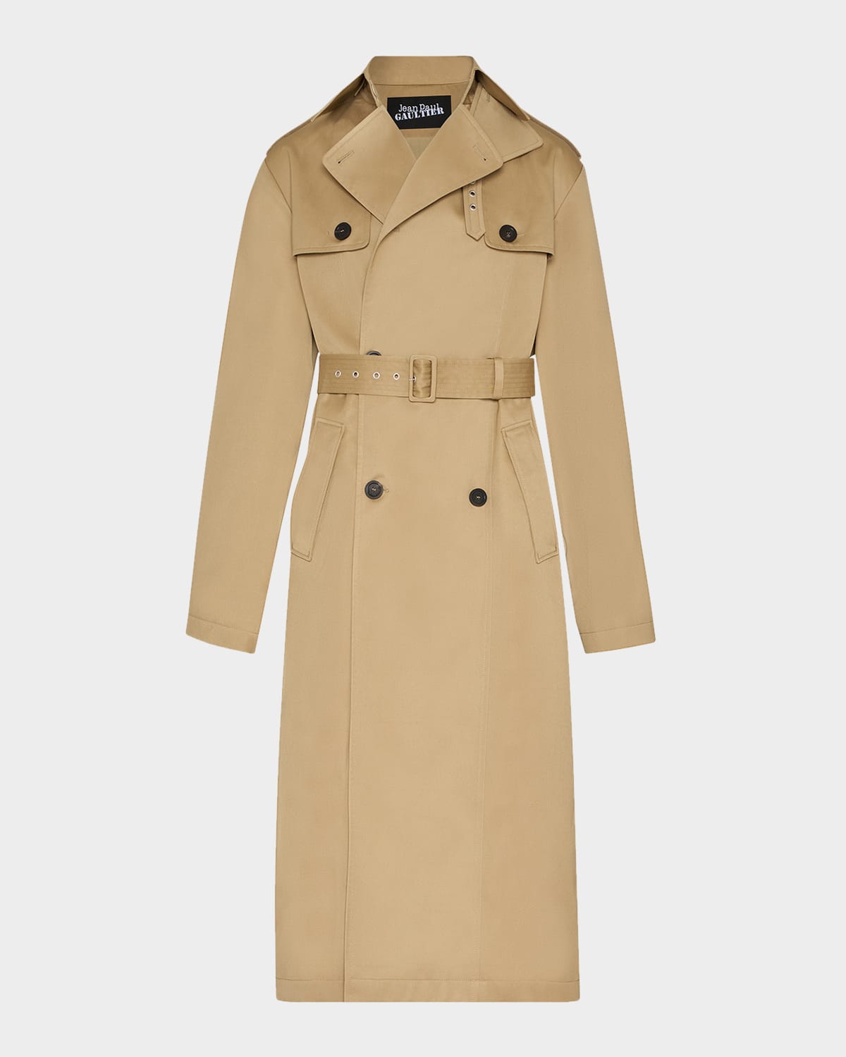 Jean Paul Gaultier trench coat is cut in weatherrepelling cotton twill with a builtin hood and scarf with sleevelike buttontab ends, a selfwaist belt, and hornbutton fastening for a mix of utility and couture flair Trench collar with throat latch; doublebreasted front Long sleeves; buttontab cuffs Shoulder epaulets Chest buttongun flaps Belted waist Hip welt pockets Straight fit Hem falls below the knee Inverted box pleat hem Polyester/cotton Made in Italy