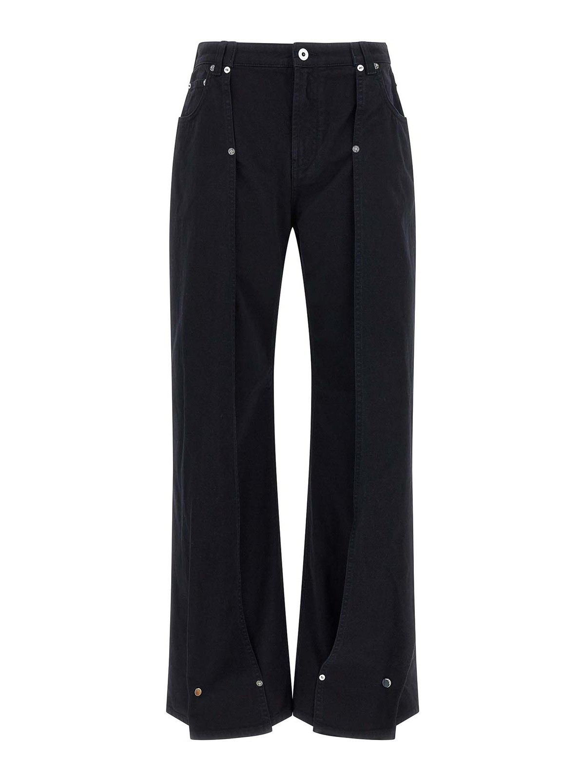 le jean en jean surteint à bouton-pression, fermeture éclair et bouton, jambe large avec poches découpées, extérieures et rivets, étiquette logo au dos