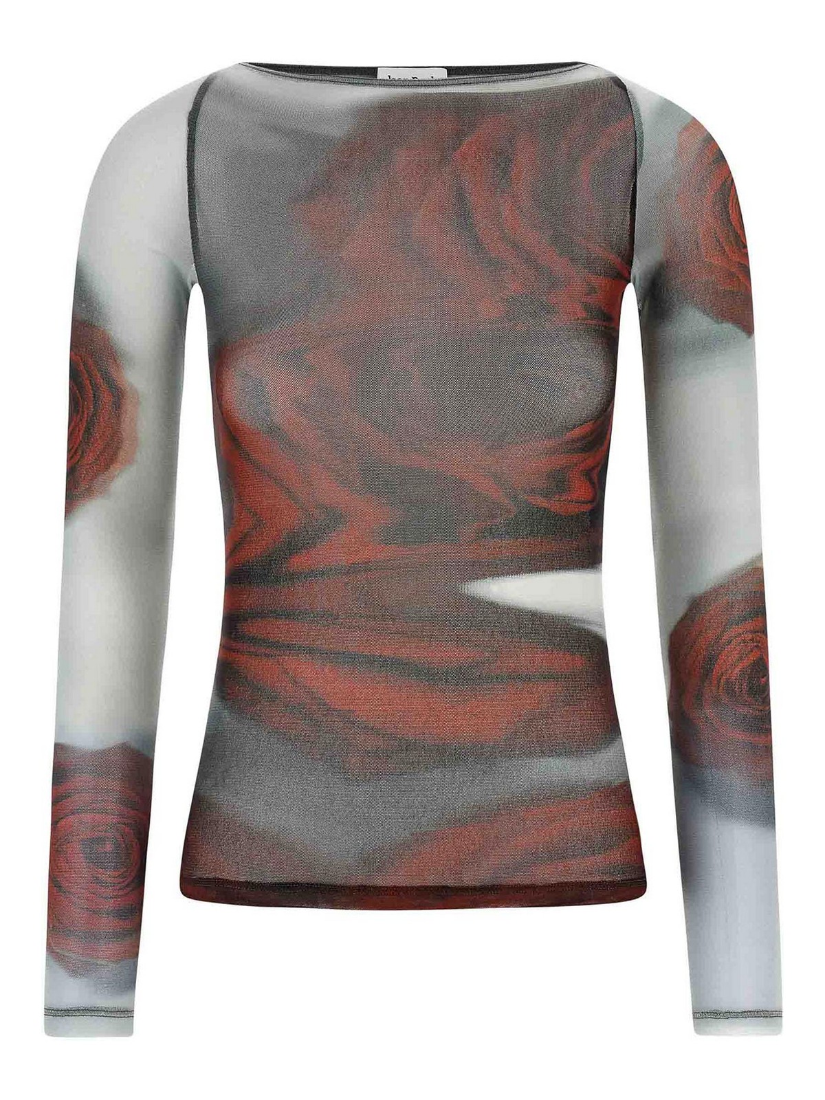 Top en tulle stretch semi-transparent avec imprimé intégral « les roses rouges floues », col bateau et manches longues