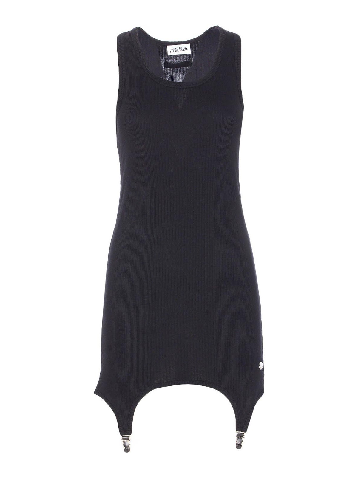 Débardeur noir Jean Paul Gautier, col rond, plaque sans manches, logo sur le nom du créateur. Couleur: noir