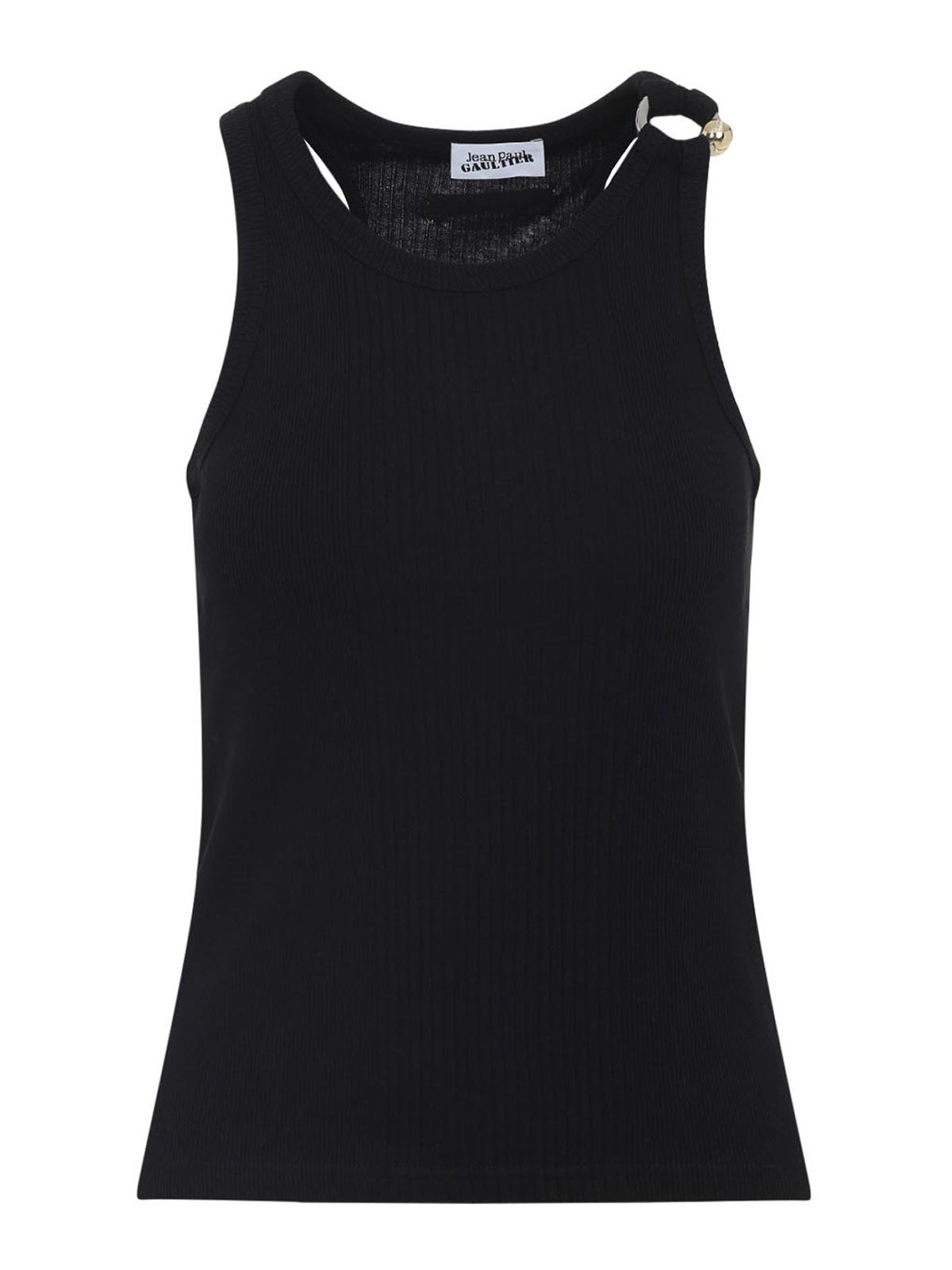 Haut en coton noir avec piercing Jean Paul Gaultier. Coton côtelé noir, encolure ronde, design sans manches, anneau en métal doré et argenté et perle siglée sur l'épaule, ourlet droit.