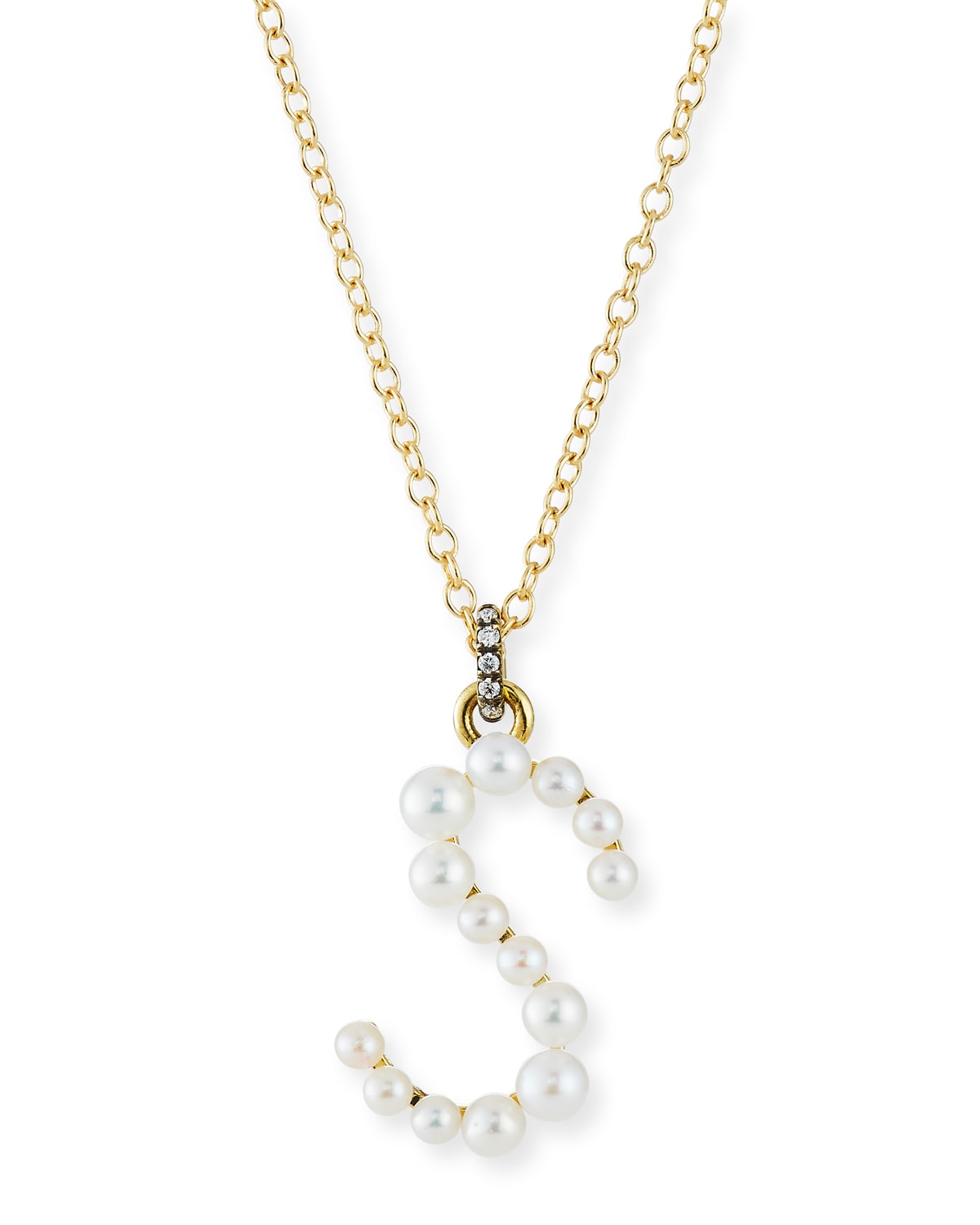 Jemma Wynne necklace from the Prive Collection. Polished 18karat yellow with black rhodium. Diamonds at bail and pearls at "S" pendant. Naturally white freshwater cultured pearls. 0.02 total diamond carat weight. Approx. 20"L. Made in USA.