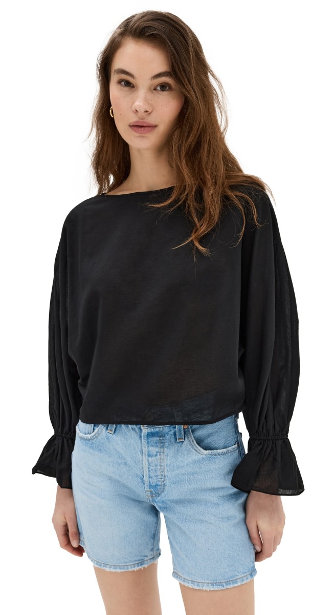 Fabric: Lightweight, non-stretch weave. Long sleeves with flared elastic cuffs. Boat neck. Shell: 86% cotton/14% linen. Hand wash. Imported, China. Measurements: Measurements from size XS Length: 19.75in / 50.0cm, from shoulder