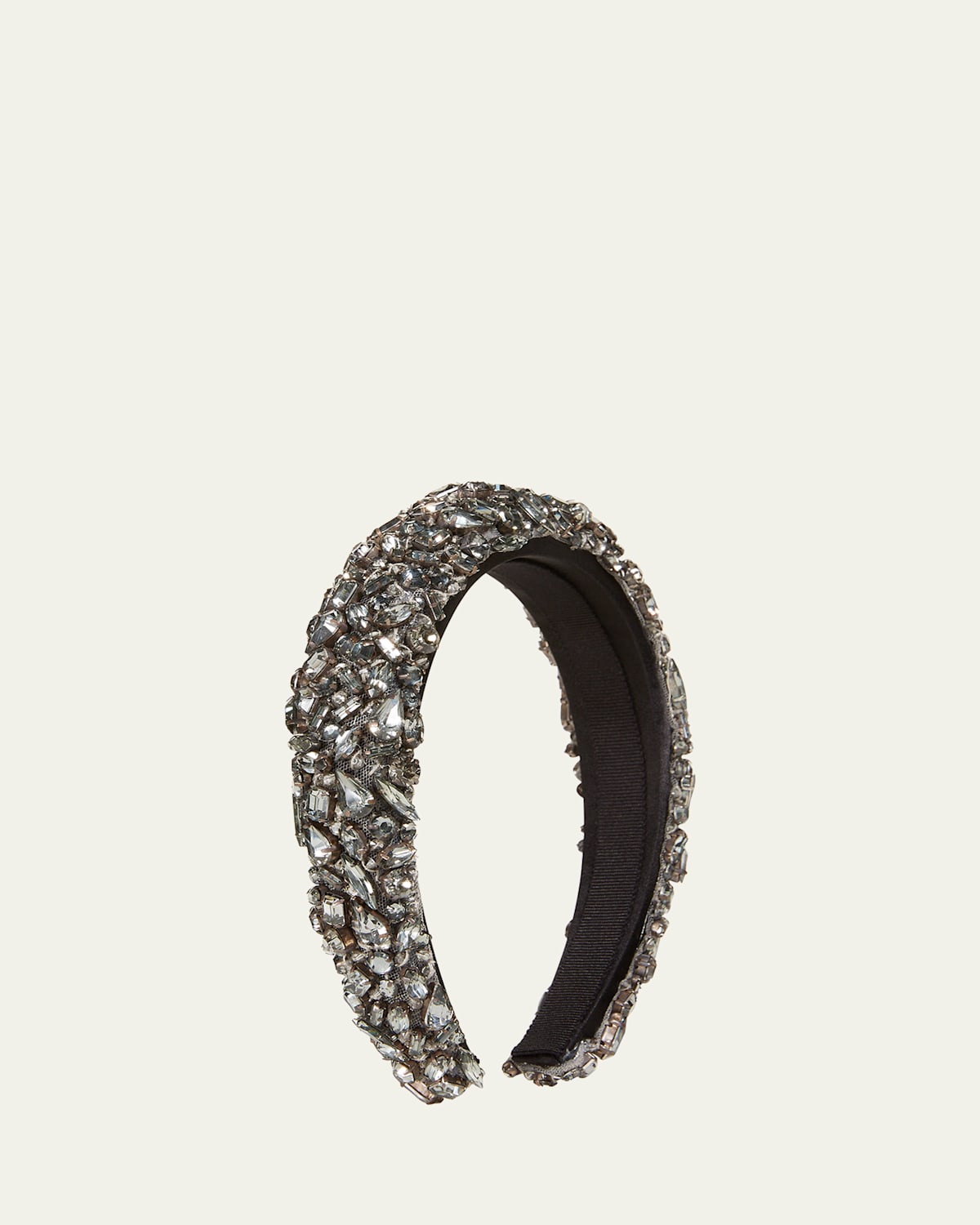 Jennifer Behr "Czarina" headband with allover assorted crystal embellishments. Approx. measurements: 7"W x 1.5"D x 7"T. Glass and resin embroidery. Foam padded plastic base. Rayon ribbon. Made in USA of imported material.