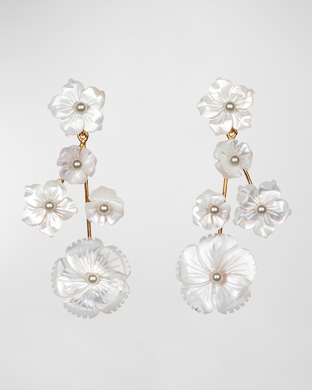 Jennifer Behr earrings Approx. 2.25" long 24karat goldplated brass Handcarved motherofpearl flowers Naturally hued freshwater cultured pearls For pierced ears Wipe clean Made in USA