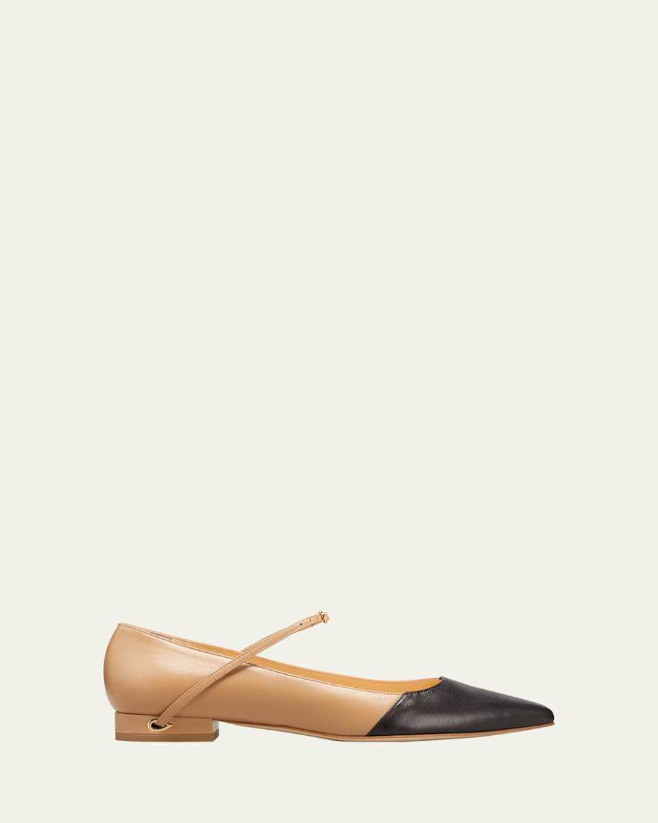 Jennifer Chamandi "Lorenzo" ballet flat in twotone napa leather. Signature strap goes through the 'Eye of the Needle' hole in the heel and is completely removable so you can wear your shoes with or without the strap. 0.8" flat heel. Pointed toe. Goat leather lining. Made in Italy.