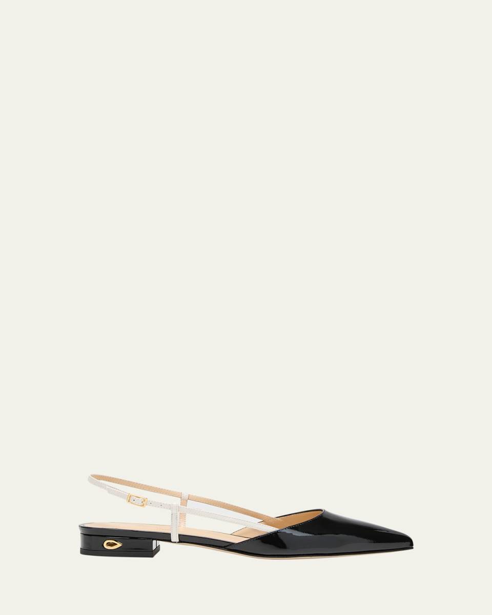 Jennifer Chamandi "Mario" ballerina flats in twotone leather. Signature 'Eye of the Needle' hole in the heel. 0.75 in / 20 mm flat heel. Pointed toe. Anchored slingback strap. Goat leather lining. Made in Italy.
