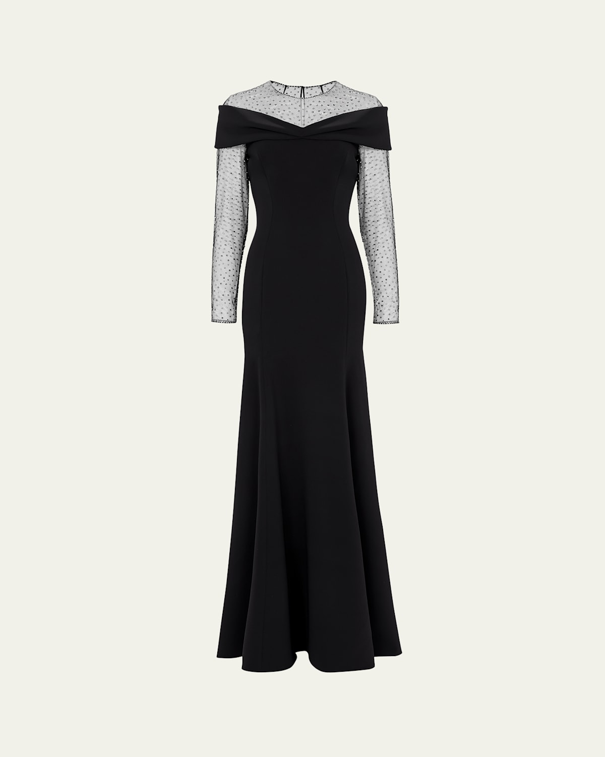 Jenny Packham "Etienne" gown featuring a strass embellished mesh shoulders and sleeves High neckline; foldover offtheshoulder illusion Long sleeves Trumpet silhoette Floor length Back zip Polyester/nylon/polyamide Imported