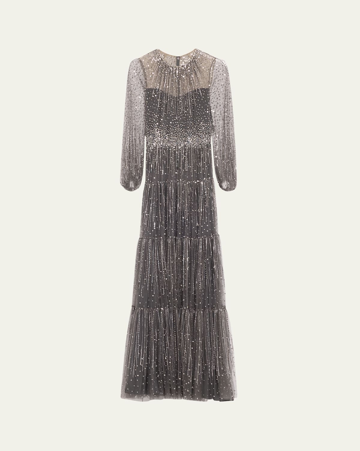 Jenny Packham "Solar" tulle gown features crystal sequin and bead embellishment Jewel neckline; illusion neckline Long sleeves Sheath silhouette Floor length Back zip Polyester self/lining Dry clean Imported