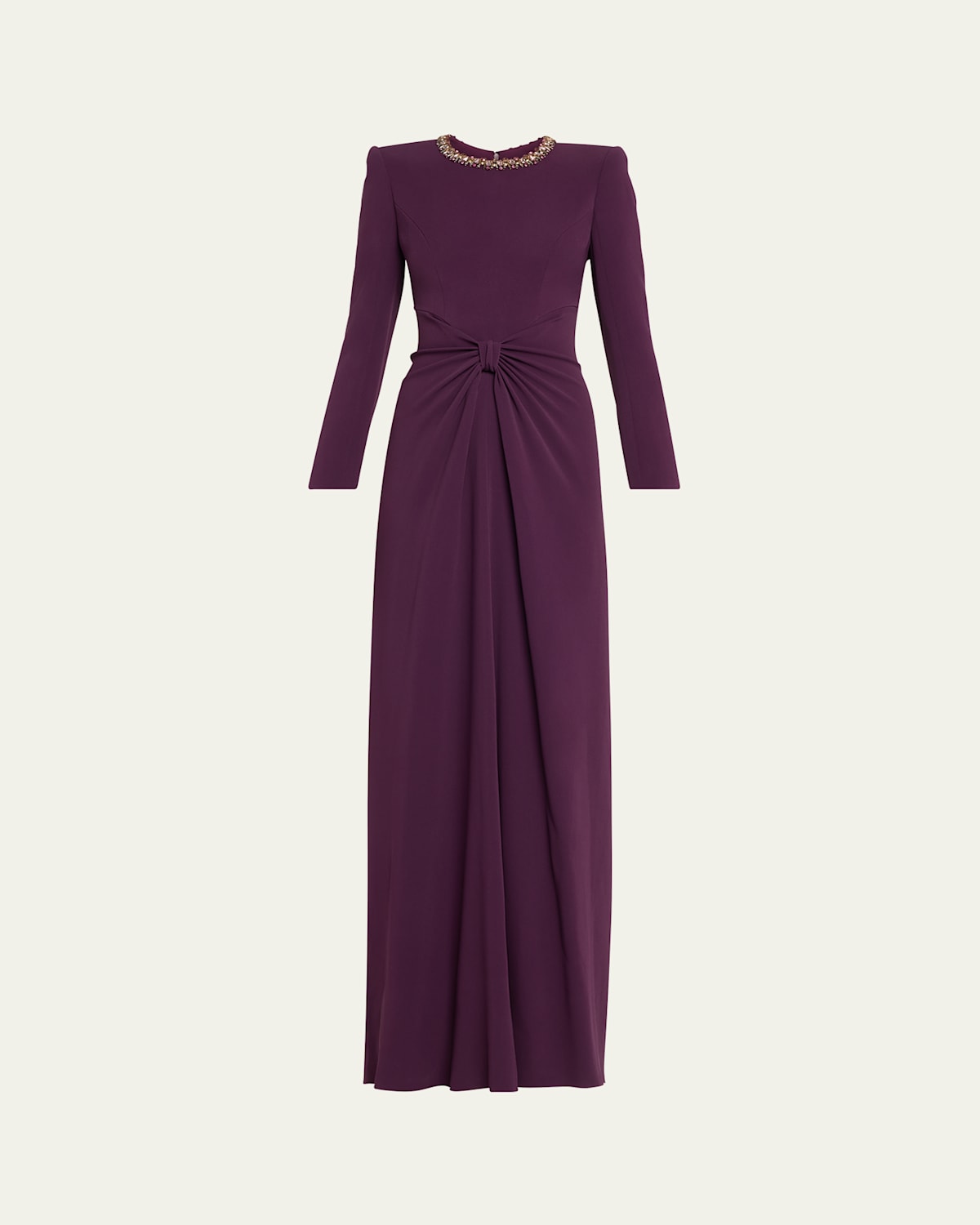 Jenny Packham "Sunday" dress with a crystalembellished neckline and knotted waist detail Jewel neckline Long sleeves Structured shoulders Floor length Sheath silhouette Back zip Polyester/polyurethane Imported