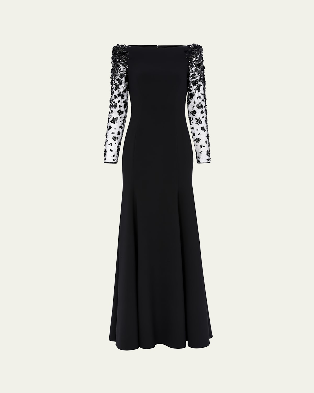 Jenny Packham "Sylvia" crepe gown embellished with beaded sheer sleeves Wide high neckline Long sleeves Trumpet silhouette Floorsweeping hem Center back zip Polyester/polyurethane/nylon/polyamide Lining: Polyester Dry clean Imported