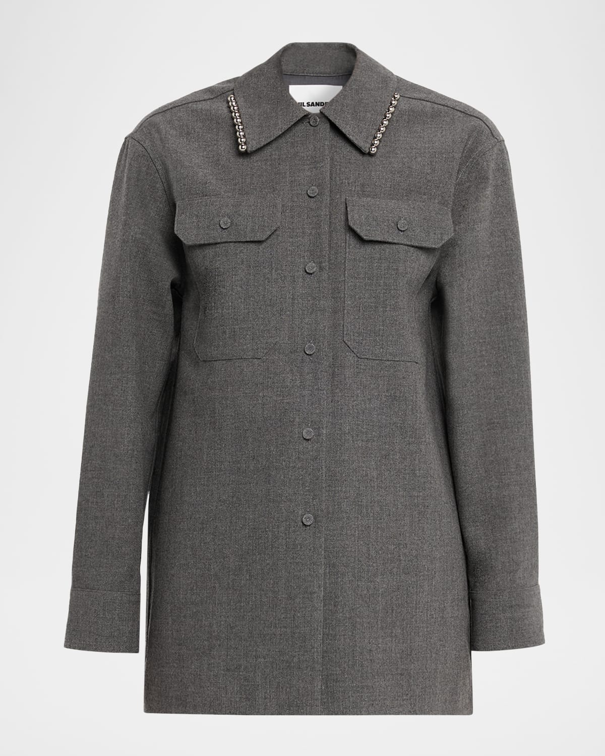 Jil Sander shirt is tailored in a woven wool featuring silvertone beading along the collar and selfcovered buttons Point collar; button front Long sleeves; button cuffs Chest buttonflap pockets Straight fit Hem falls below the hip Wool Dry clean Trim: Metal Made in Italy