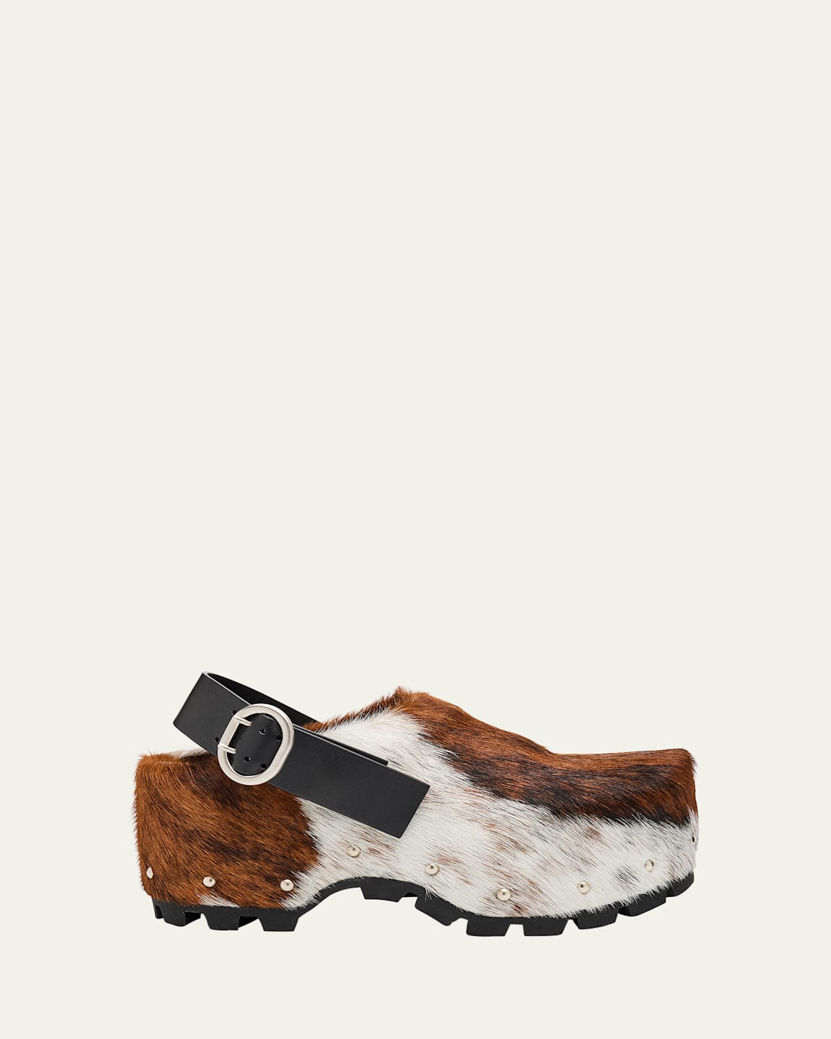 Jil Sander clogs in natural calf hair (Italy), calfskin leather, and polyethylene terephtlatate (pet) 2.00 in / 50 mm platform heel Round toe Adjustable buckle ankle strap Slipon style Studs on midsole Rubber lugged outsole Professional cleaning recommended Made in Italy
