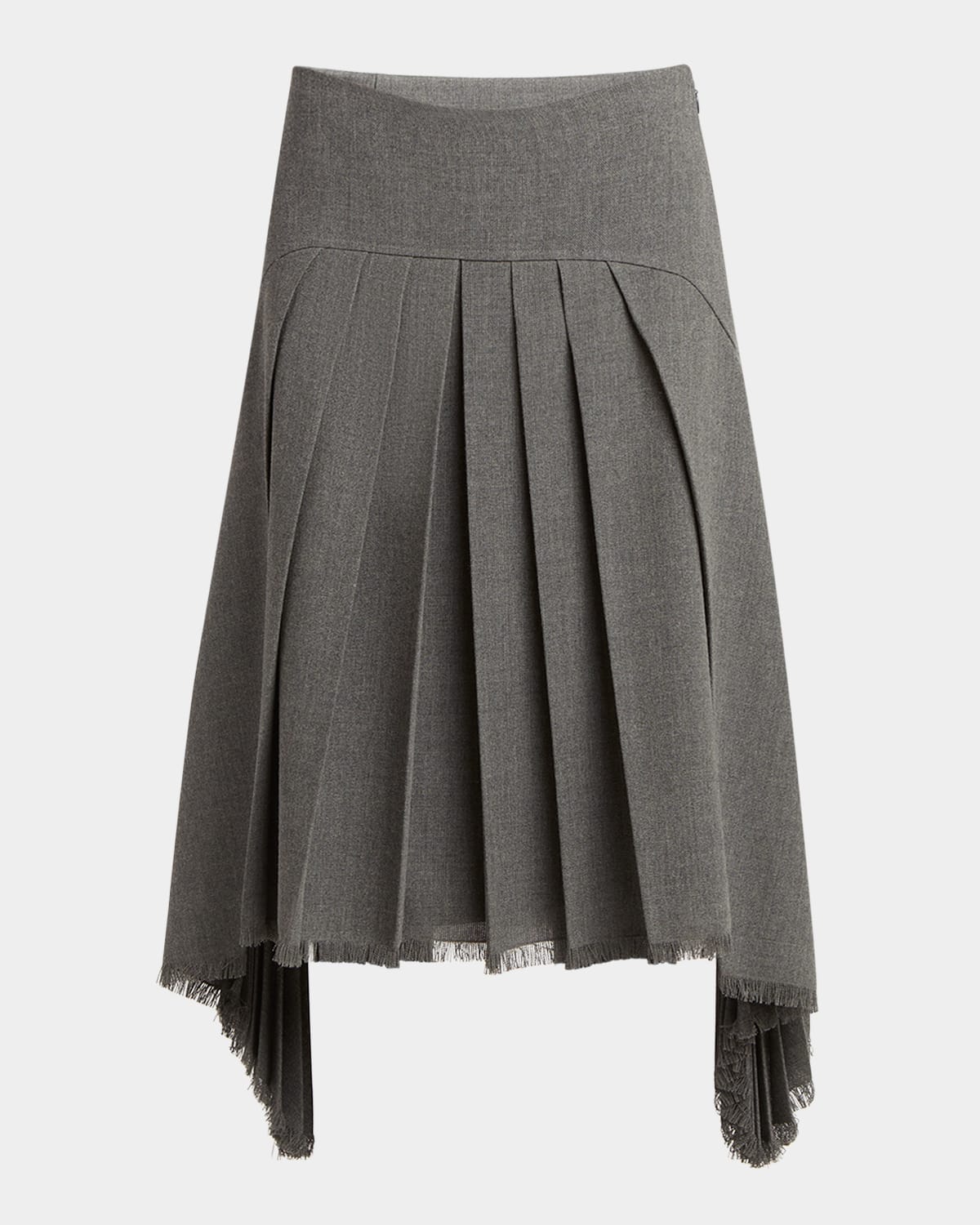 Jil Sander skirt finished with a curved yoke, pleating, and a fringed hem Mid waist Hem falls below the knee Skirt falls straight from hip to hem Handkerchief hem Side zip Wool Lining: Viscose Dry clean Made in Italy