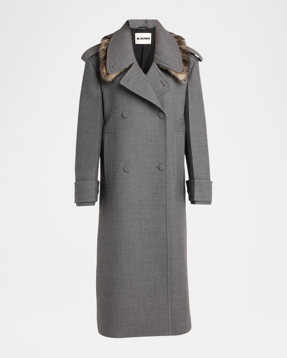 Jil Sander coat is tailored in crisp wool featuring a detachable dyed sheep shearling (Italy) under collar Approx. 47"L from shoulder to hem Notch lapels; doublebreasted front Long sleeves; thick buttontab cuffs Shoulder epaulets Hip welt pockets Straight fit Full length Walking vent back Button closure Wool Lining: Viscose Dry clean Trim: Fur Made in Italy
