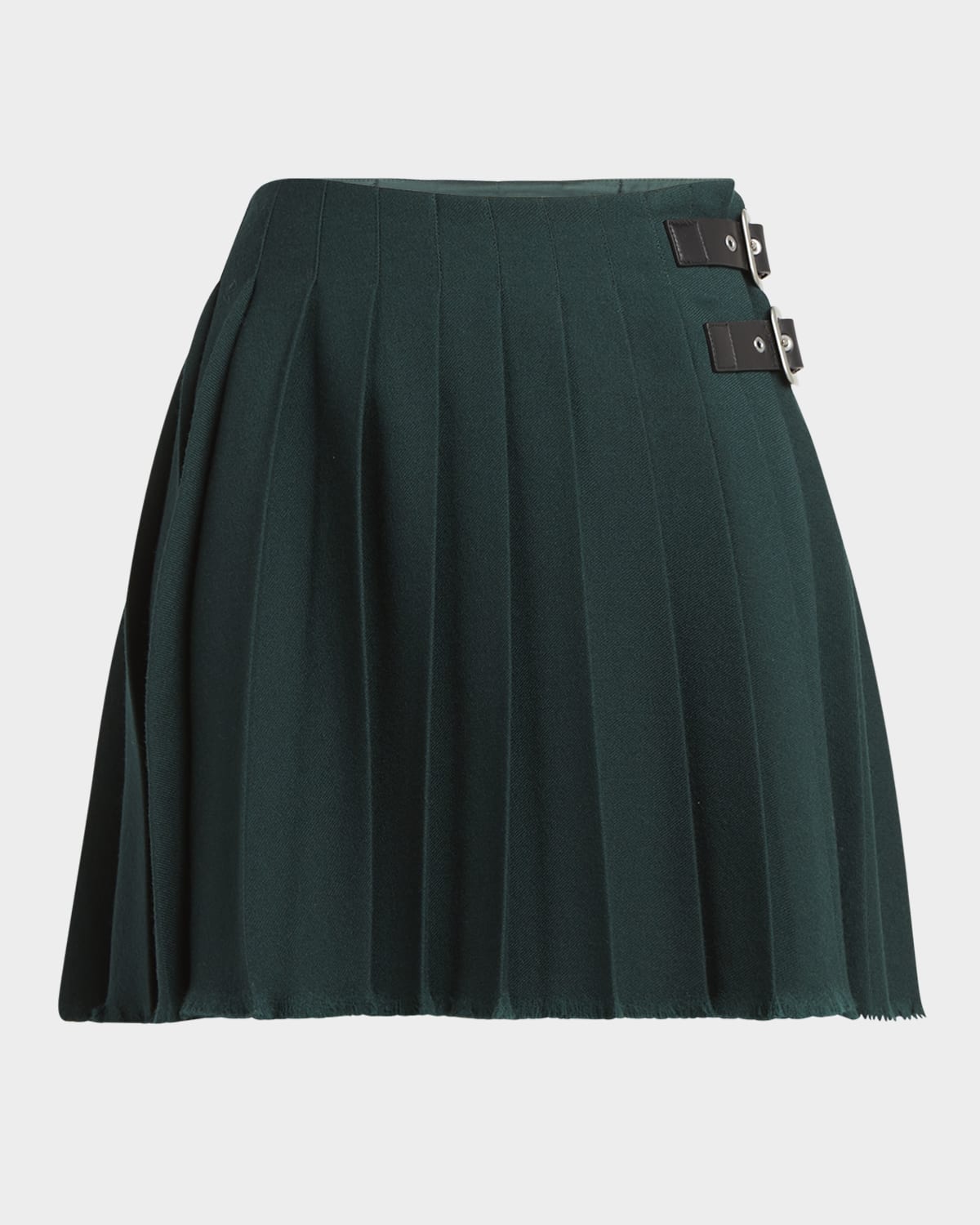 Jil Sander kilt skirt finished with pleating, leather buckles on the hip, and a frayed hem High waist Midthigh length Aline silhouette Zip closure Wool Lining: Viscose Dry clean Made in Italy