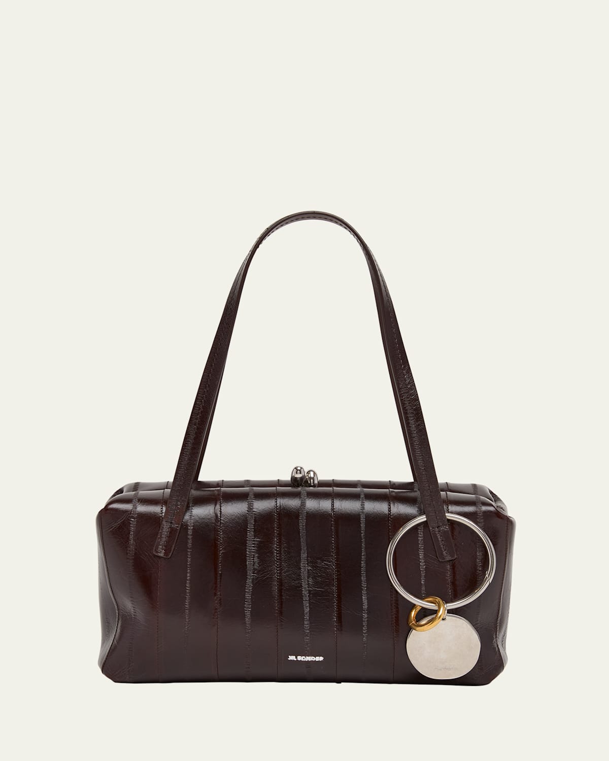 Designed in luxurious eel leather, this Jil Sander "Goji" shoulder bag features a puffy silhouette and detachable medallion charm for a bright accent Flat shoulder straps Framed top with kisslock closure Interior, one slip pocket Lining: Leather Approx. 6.5"H x 10"W x 4"D Professional cleaning recommended Made in Italy