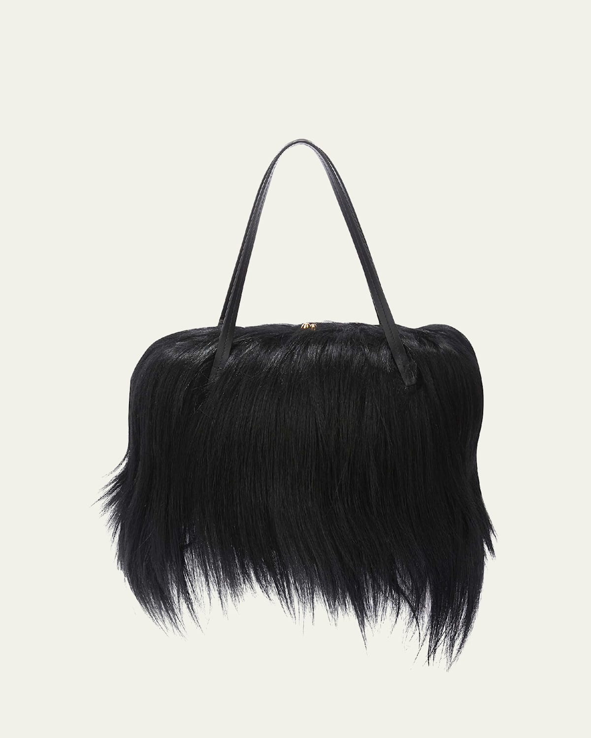 Jil Sander "Goji" top handle bag in leather, cashmere, and faux hair (viscose/nylon/polyester) Shoulder straps Structured top with kisslock closure Approx. 9.4"H x 9.4"W x 5.1"D Made in Italy