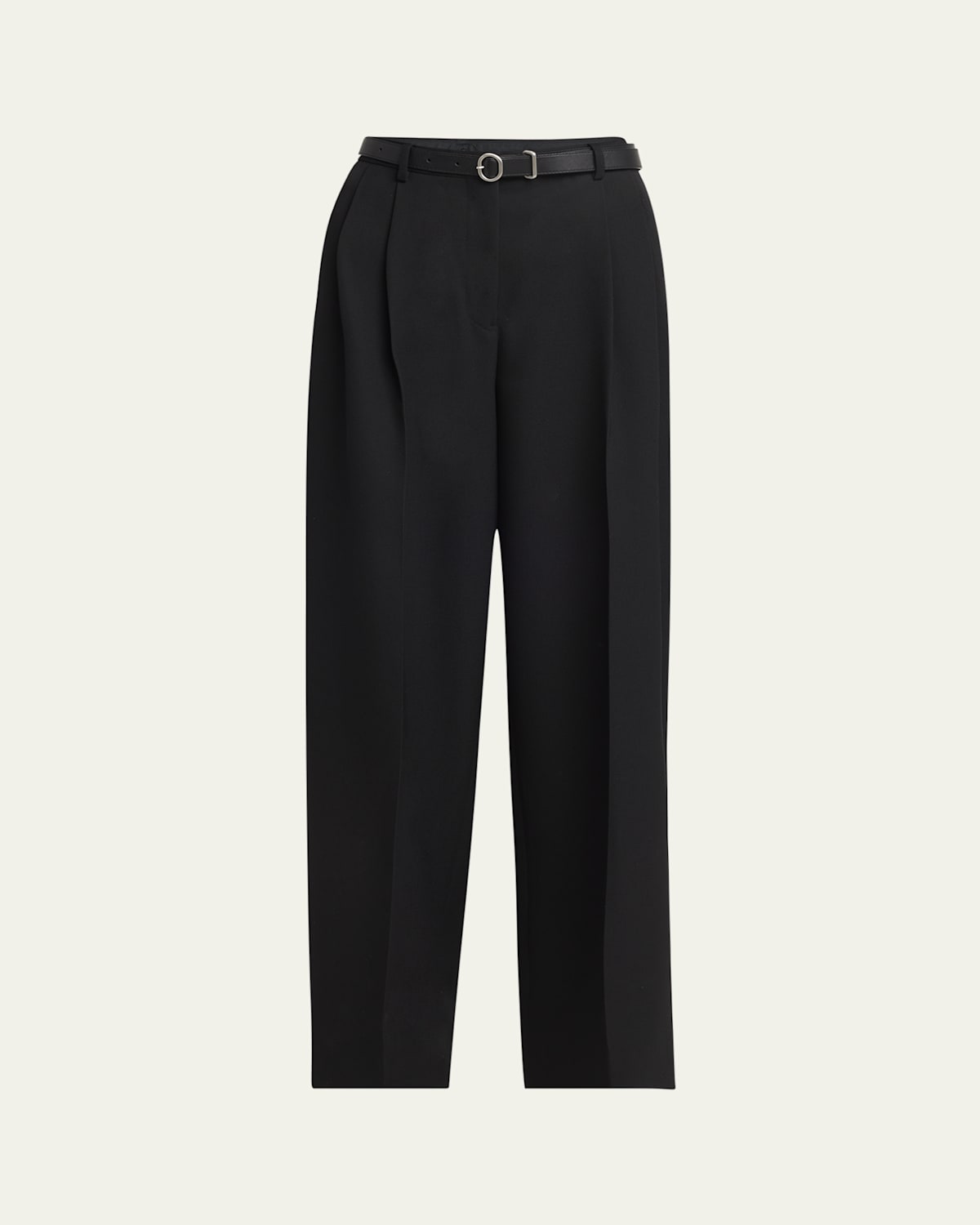 Jil Sander relaxedfit trousers with a pleated front Approx. measurements: 12.0" rise; 30" inseam; 42" outseam Full length Mid rise sits high on hip Wide legs Tab/zip fly; belt loops Wool Unlined Dry clean Made in Italy