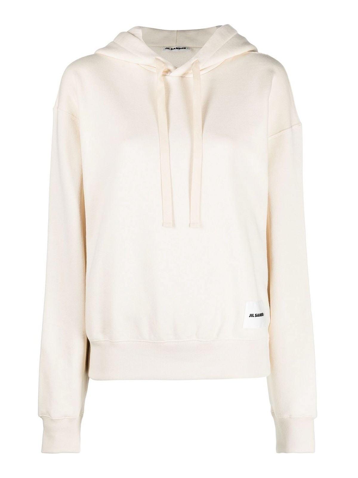 Sweat à capuche beige avec cordon de serrage de la marque Jil Sander en coton stretch, écusson logo sur le côté, capuche souple avec cordon de serrage, manches longues et bord côtelé