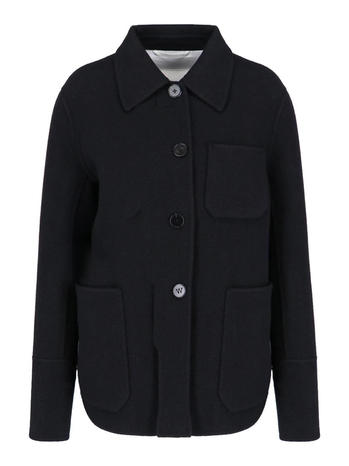 Veste, chemise en laine vierge Jil Sander, col classique, boutons, poignets, poche poitrine, deux poches plates sur le devant, ourlet incurvé