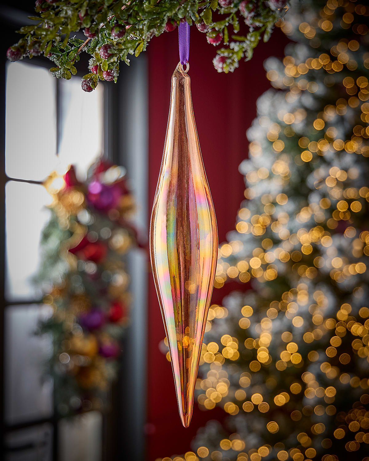 Decorate your Christmas tree with glamour with this ornament, featuring an elliptical, icicleinspired shape with an iridescent finish. Handcrafted of mouthblown glass Approx. 1.5"Dia. x 12"T Wipe clean Imported