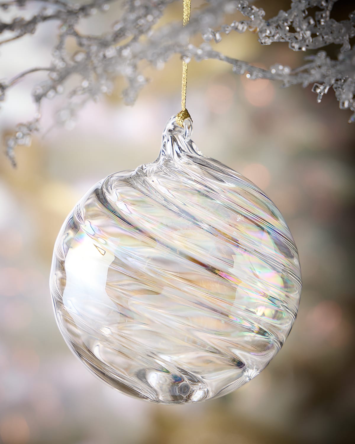 This colorless orb is reminiscent of winter weather during the Christmas season. The iridescent glass ornament fits any Christmas tree theme. Handcrafted of glass Approx. 4"L x 4"W Handle with care Wipe clean Imported