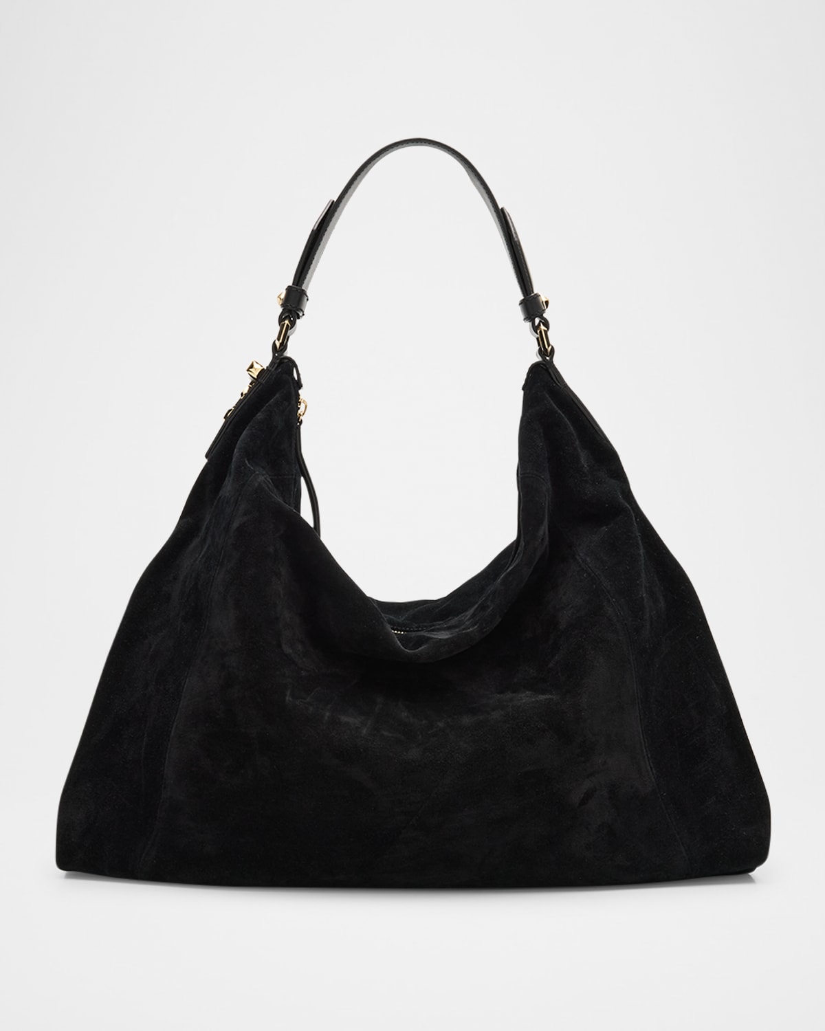 Slouchy and unstructured, the "Ana" hobo bag from Jimmy Choo is crafted in soft suede with smooth leather details and subtle goldtone accents Leather shoulder strap, 11" drop Zip top closure Interior, one zip pocket Lining: Polyester Trim: Leather Approx. 15.4"H x 16.9"W x 1.2"D Made in Italy