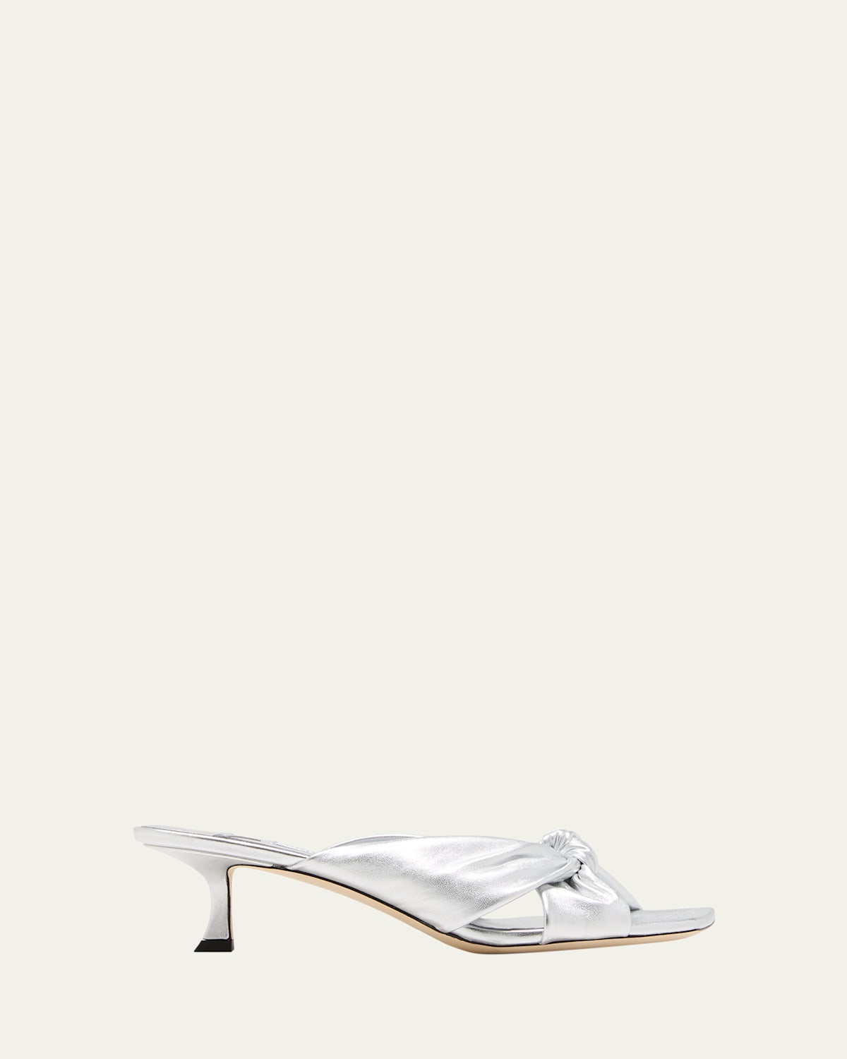 Jimmy Choo "Avenue" metallic leather mule sandals 2.00 in / 50 mm stiletto heel Open toe Crisscross knotted vamp Slide style Leather outsole Lining: Leather Made in Italy