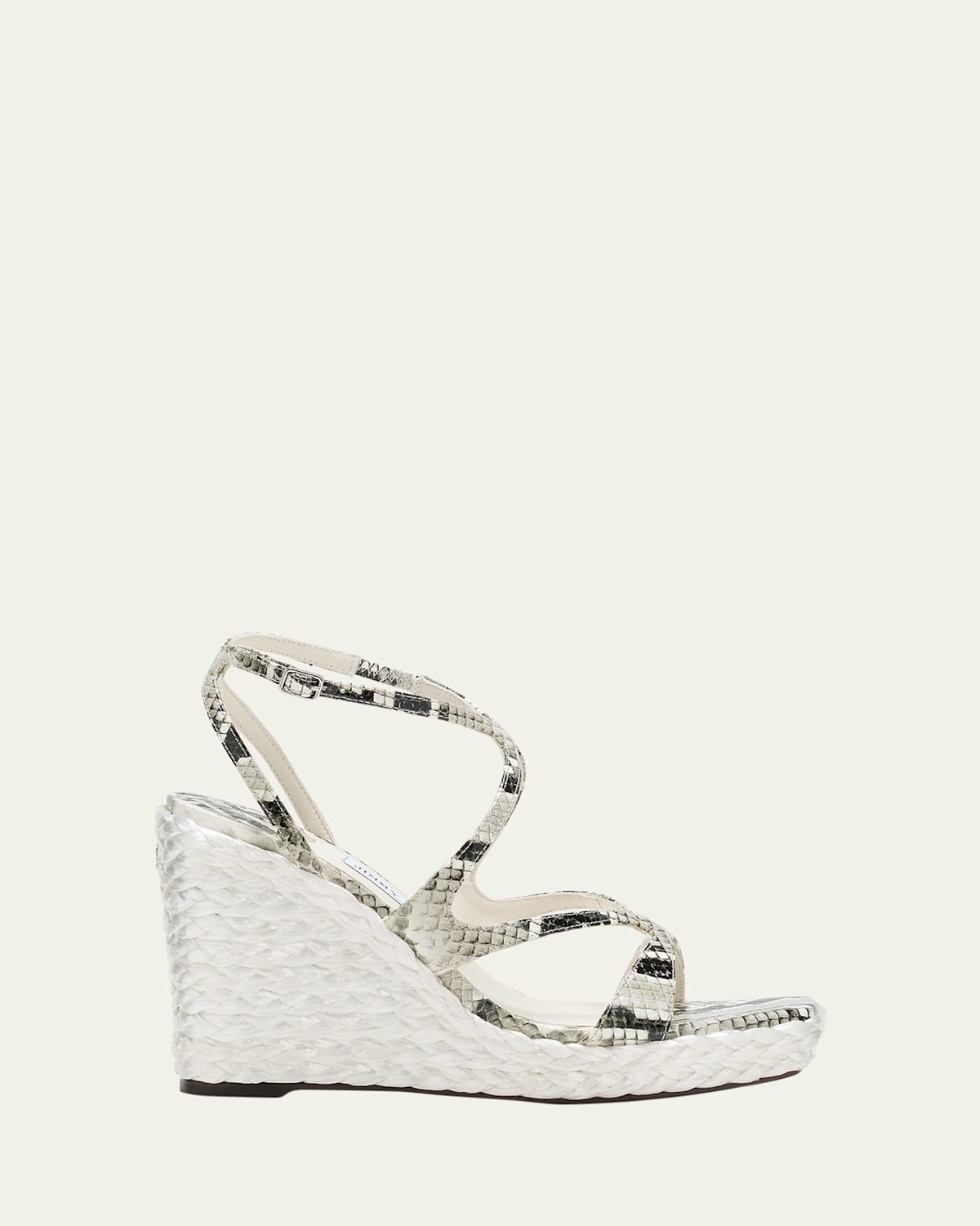 Jimmy Choo "Ayla" snakeembossed leather espadrille sandals 4.33 in / 110 mm braidedjute wedge heel Open toe Caged vamp Adjustable ankle strap Leather/Rubber outsole Lining: Leather Made in Spain