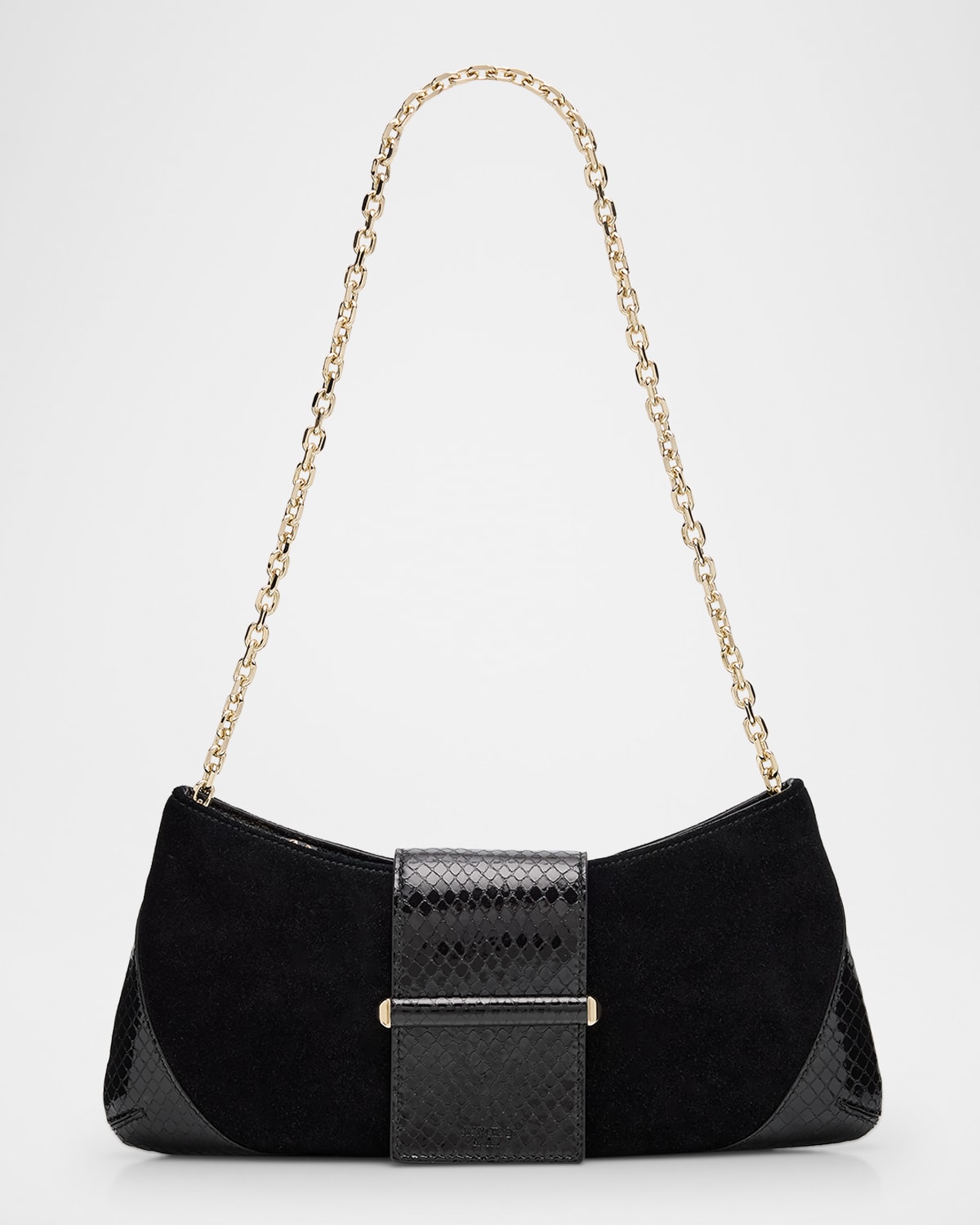 Jimmy Choo "Bar" slim shoulder bag in suede with snakeembossed leather accents Chain shoulder strap Zip top closure with flap Interior, one slip pocket Lining: Polyester Trim: Leather Approx. 5.9"H x 11.8"W x 0.8"D Made in Italy