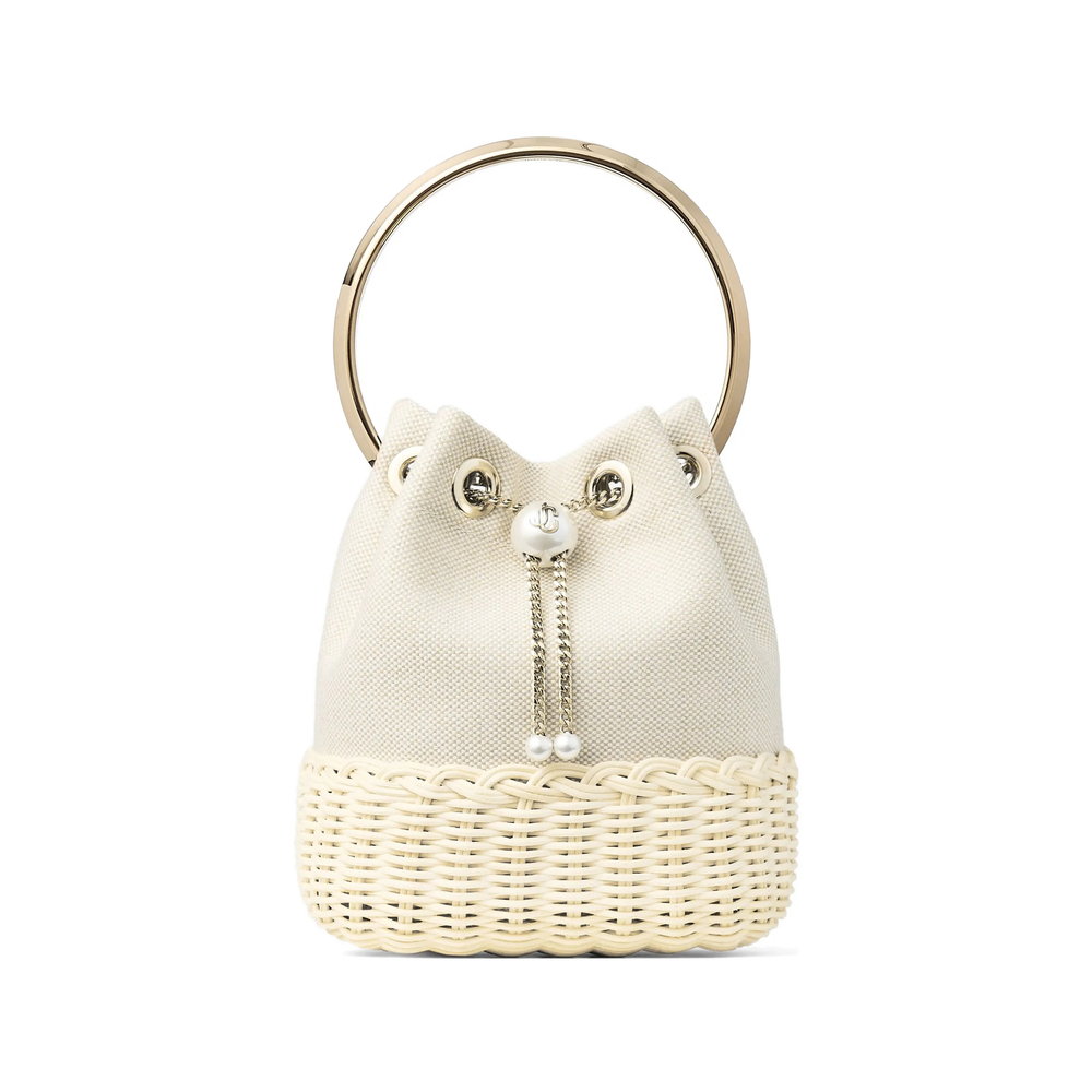 grey and neutral woven detail top handle chain shoulder strap pearl detail drawstring fastening