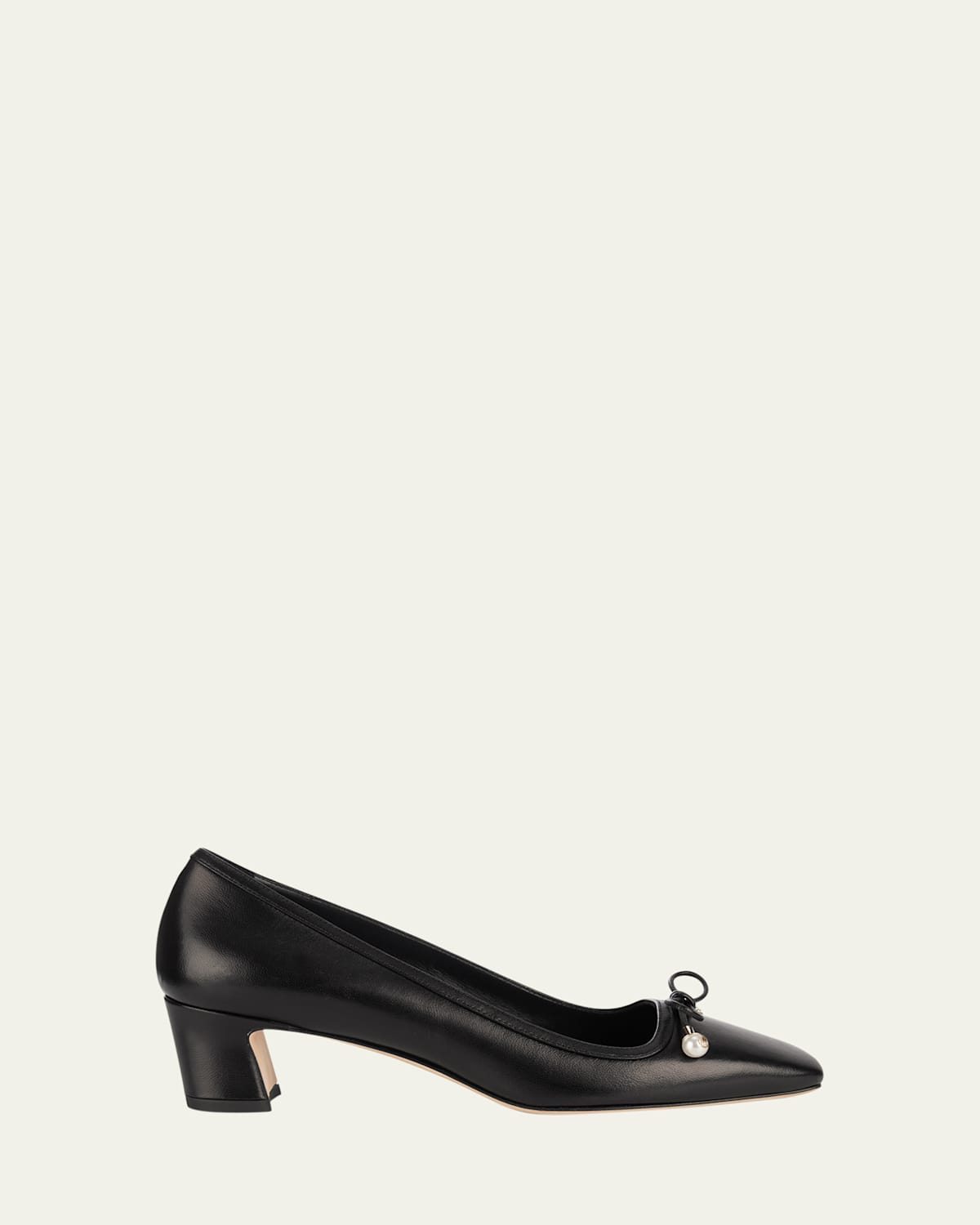 Jimmy Choo "Elme" leather ballerina pumps with pearly crystal bow accent 1.75 in / 45 mm block heel Round toe Slipon style Leather/Rubber outsole Lining: Leather Wipe clean Made in Italy