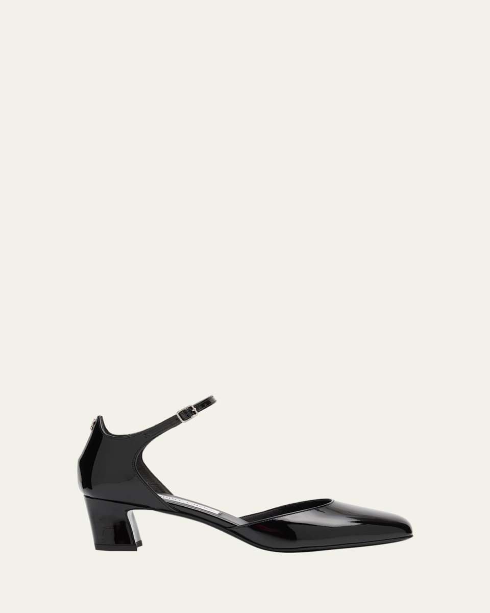 Jimmy Choo "Pixie" patent leather pumps 1.75" / 45 mm block heel Round toe Adjustable ankle strap Leather lining Leather/rubber outsole Made in Italy