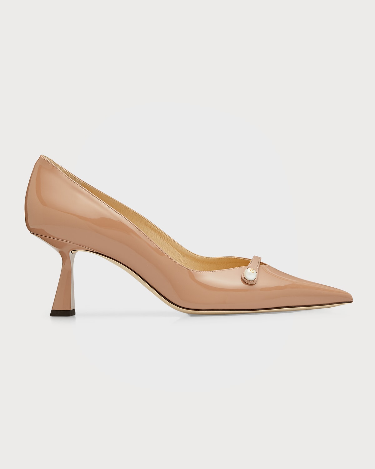 Jimmy Choo "Rosalia" patent leather pumps with pearly stud button strap accent 2.50 in / 65 mm architectural heel Slipon style Pointed toe Leather outsole Made in Italy