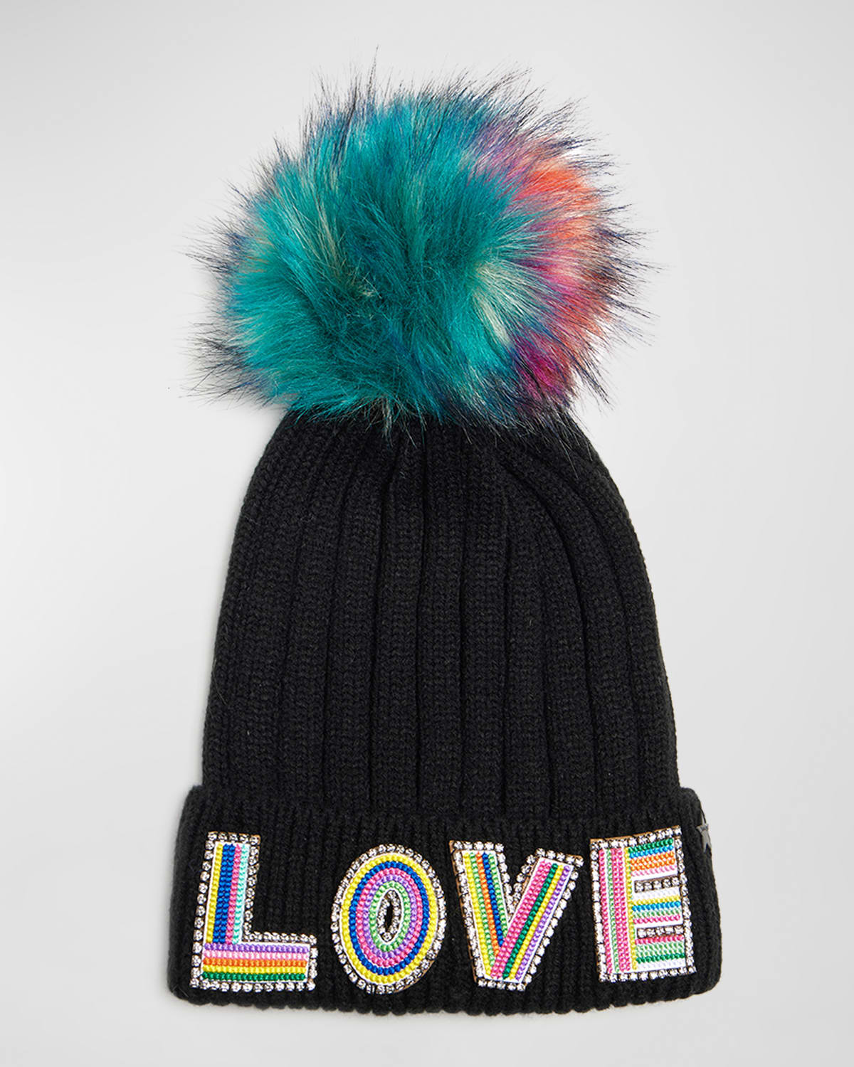 Jocelyn knit beanie with "Love" features patches embroidered at the front and a faux fur pom Round crown Foldover brim Faux fur (acrylic/polyester/modacrylic) Acrylic/wool/polyester Wash separately, do not iron, hand wash Imported