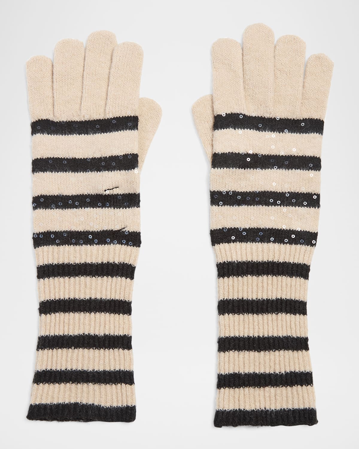 Jocelyn long gloves in striped, sequined knit polyester and spandex Approx. 7"L x 4"W Logo star on corner Item Weight (Lbs.): 0.3 Do not iron, hand wash Imported