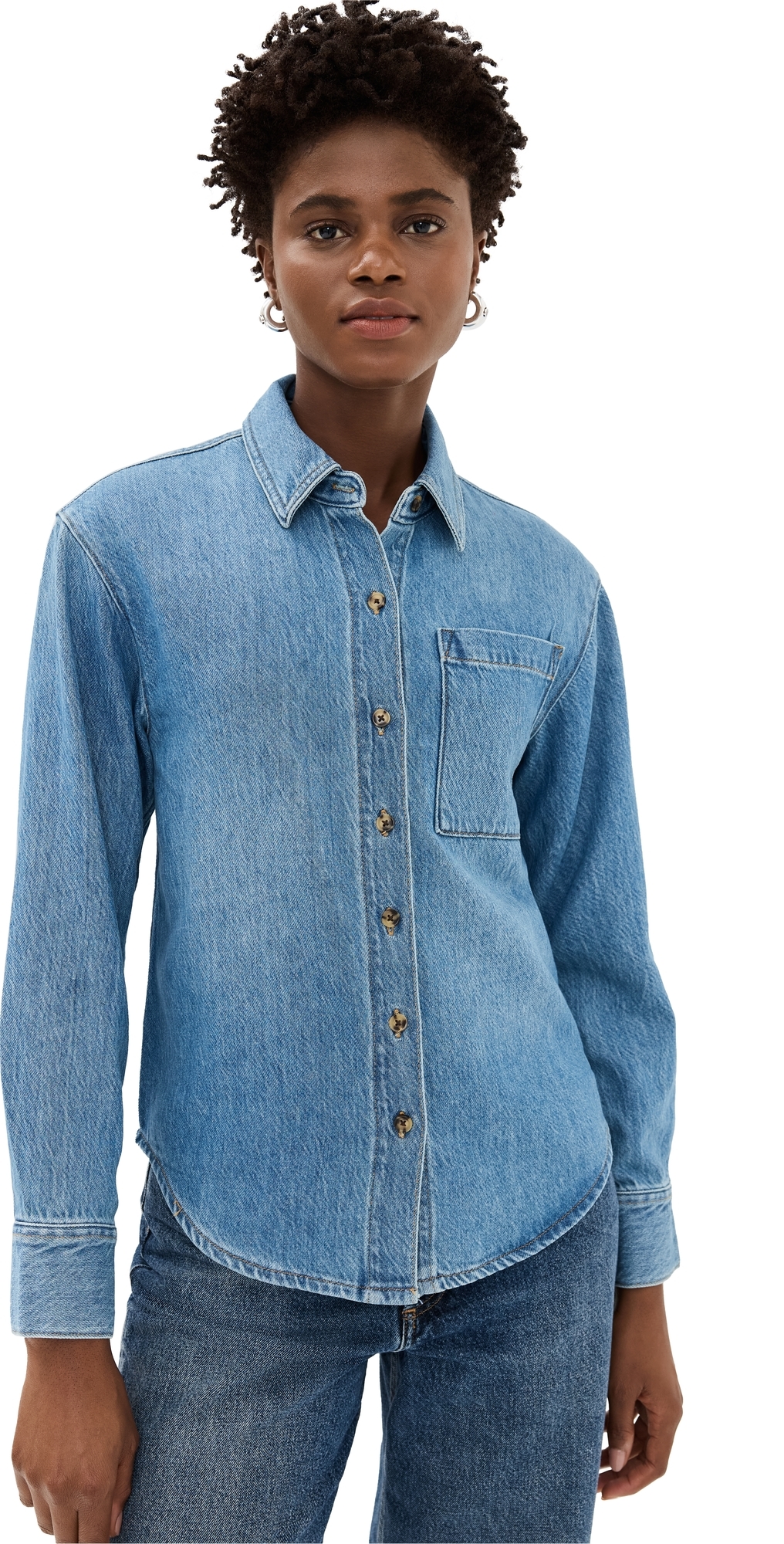 Fabric: Mid-weight, non-stretch denim. Collared neck. Long sleeves with button cuffs. Button placket. Patch breast pocket. Shell: 72% cotton/28% lyocell. Wash cold. Imported, China. Measurements: Measurements from size S Length: 25.5in / 65.0cm, from shoulder