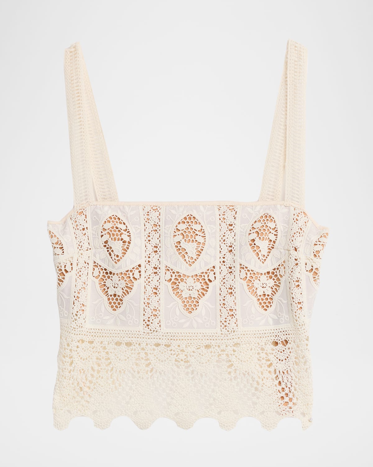 Johanna Ortiz "Casablanca" top embellished with crochet lace embroidery and crochet knit scalloped hem Square neckline Sleeveless Fitted Back zip Polyester Made in Colombia