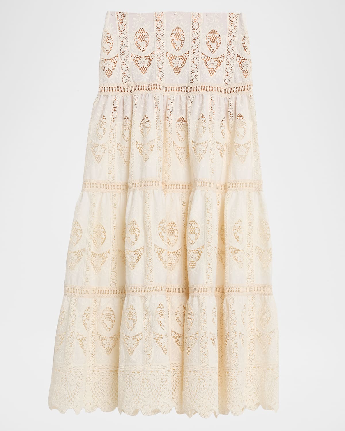 Johanna Ortiz tiered skirt finished in crochet lace embroidery High waist Full length Aline silhouette Back zip Polyester Made in Colombia