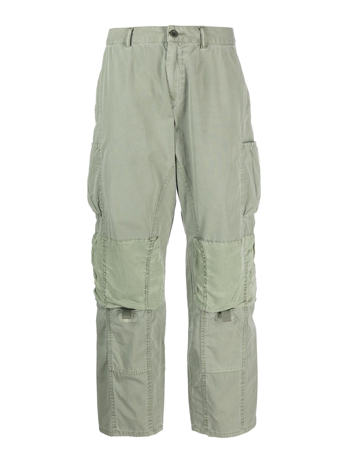 Pantalon de travail taille moyenne à jambe droite de la marque John Elliott, doté d'un bouton taille mi-taille sur le devant et d'une fermeture zippée, de deux poches plaquées sur le devant, de deux poches latérales, de deux poches arrière plaquées, de deux poches arrière plaquées, d'une jambe droite et d'un ourlet droit