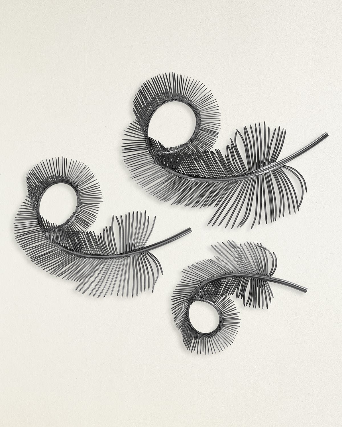 Crafted from steel, this set of three coiled plumes is a naturally inspired arrangement that translates mother nature's creations through the medium of modern design. Gorgeous asymmetry and organic curvature are showcased in full. The feathers demonstrate a spiral motion, looping in on themselves to imbue a space with a sense of depth and motion. Handcrafted of steel Hangs vertically or horizontally with brackets Overall, approx. 25"L x 4"W x 21"T Small feather, approx. 16"L x 6"W x 11.5"T Medium feather, approx. 19"L x 6"W x 14"T Large feather, approx. 25"L x 4"W 21"T Weight, 10.2lbs Wipe clean Imported Set of 3 Boxed weight, approximately 41.7lbs