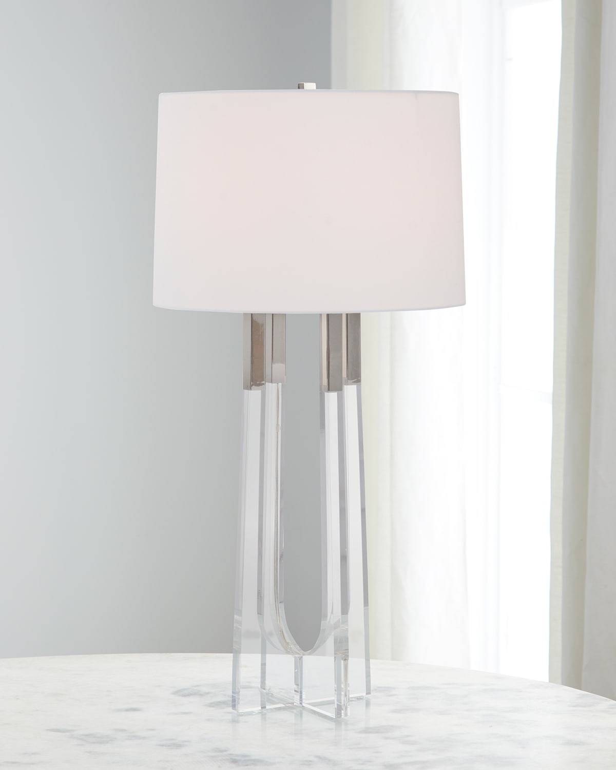 This table lamp features four acrylic columns with polished nickel accents. White manmade linen shade with white manmade silk inside. Shade: 18"Dia. (17" at top) x 12"T. Uses one 150watt, typeA bulb. Overall: 36"T. 9.5" nickel harp, turnkey. 3way switch. Imported. Boxed weight, approximately 25 lbs.