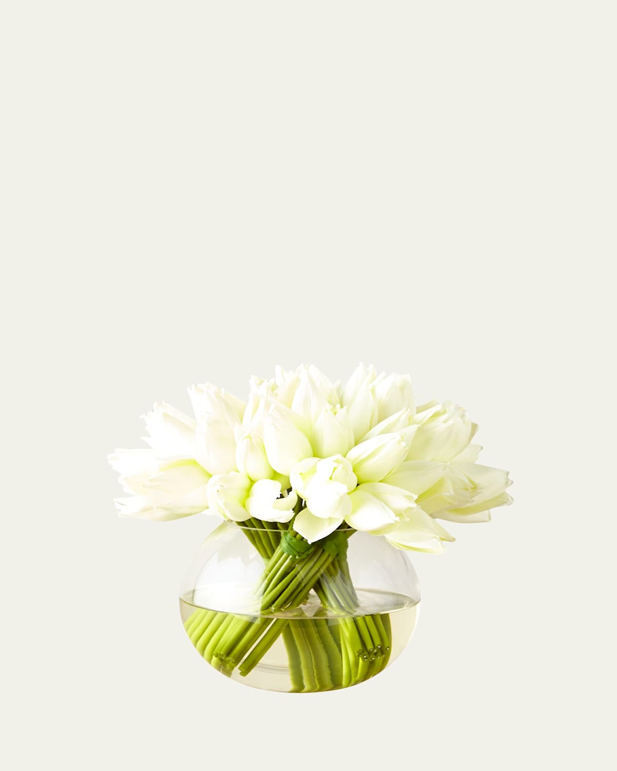 Exclusively ours. Bundles of white tulips in a round glass vase. Polyester flowers. Acrylic "water." 10"Dia. x 9"T. Handcrafted in the USA of imported materials.