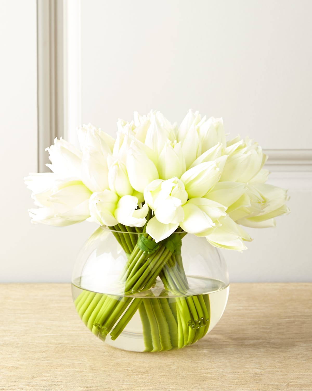 Exclusively ours. Bundles of white tulips in a round glass vase. Polyester flowers. Acrylic "water." 10"Dia. x 9"T. Handcrafted in the USA of imported materials.