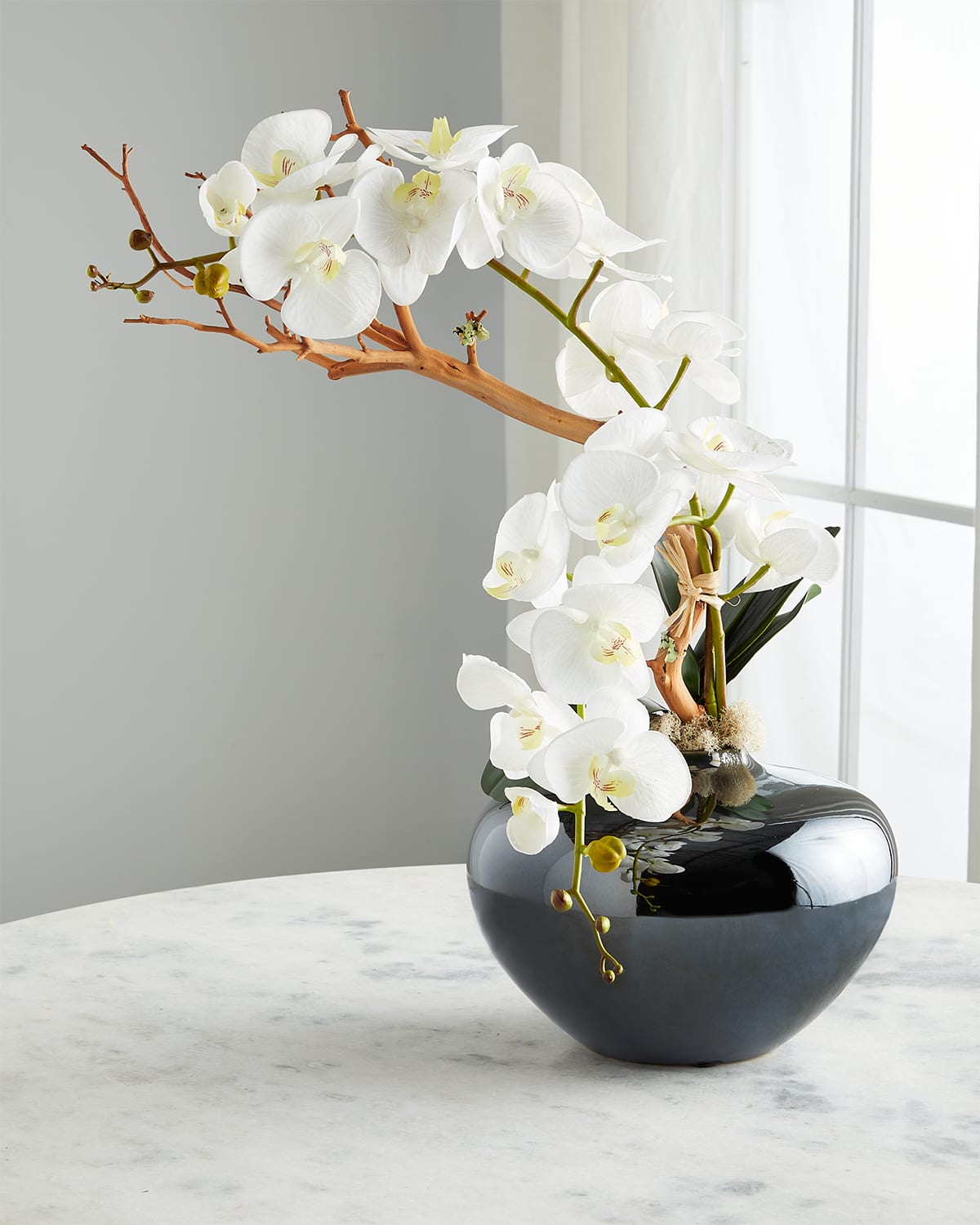 Handcrafted faux floral arrangement of asymmetrical classic white orchids entwined with manzanita Set in a black glazed ceramic container Made of polyester and wood For indoor use Approx. 14"L x 24.0"W x 27"T Item Weight (Lbs.): 8.0 Wipe clean Made in Italy