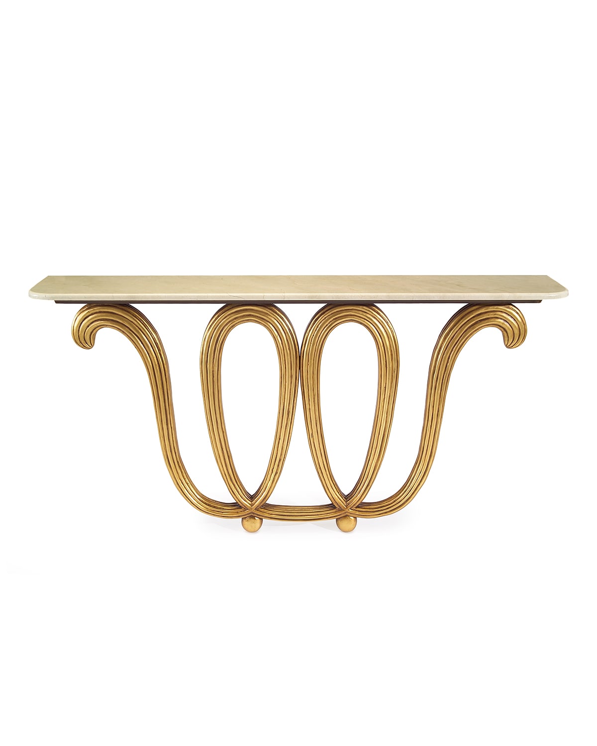 Handcrafted wall console inspired by the designer Borsani. Acacia wood base; marble top. Handpainted gilt finish. Console is not freestanding; must be secured to the wall. 70"W x 14"D x 35"T. Imported. Weight, 134 lbs. Boxed weight, approximately 203 lbs.