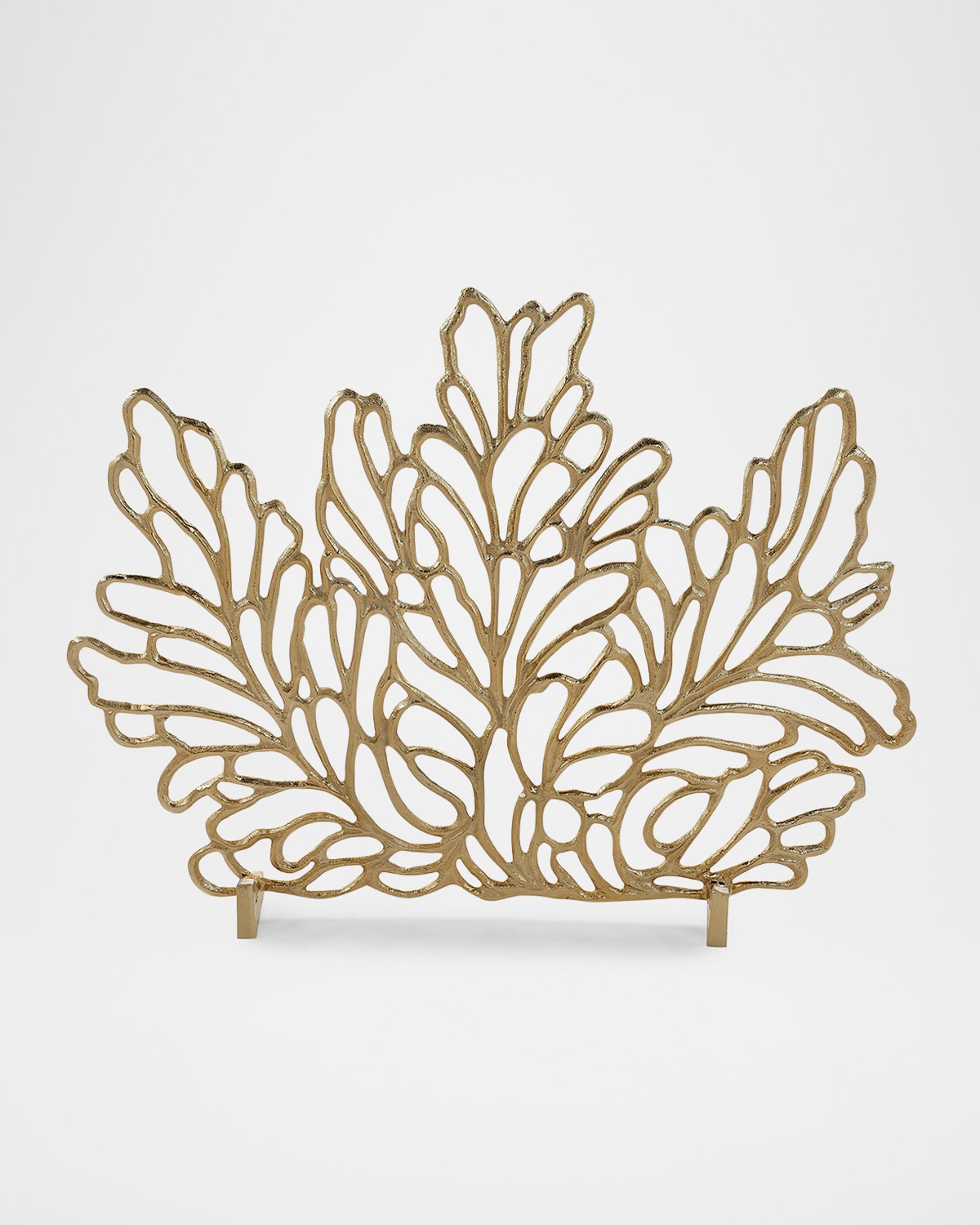 The Botanical Fire Screen is an elegant decorative accent that elevates gorgeous organic shapes with touches of opulence. This aluminum piece in a champagne finish takes the shape of a magnificent leaf, leveraging negative space for a chic stenciled look. Two slender rods at the bottom match the body and provide stability. Handcrafted of aluminum Approx. 8"D x 48.5"W x 37.25"T Item Weight (Lbs.): 22.5 Wipe clean Imported