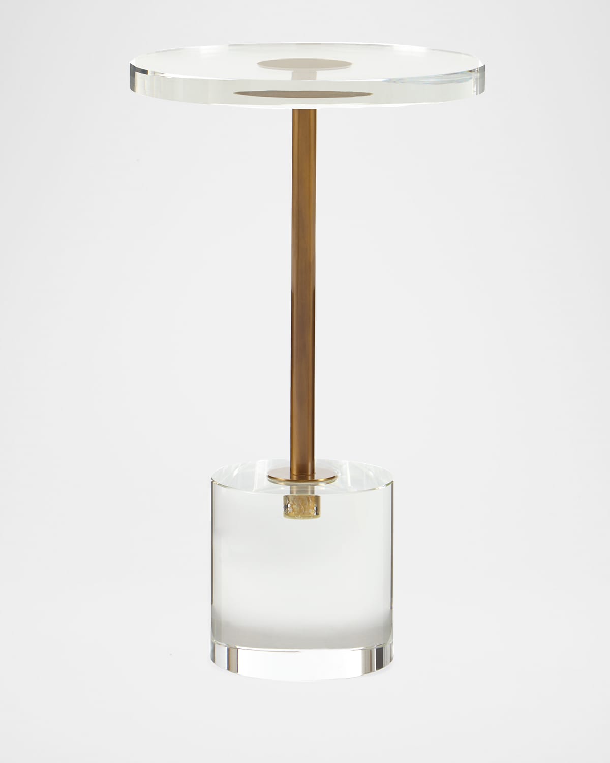 Handcrafted side table. 12"Dia. x 20.5"T. Brass, acrylic, and crystal. Imported. Boxed weight, approximately 28 lbs.